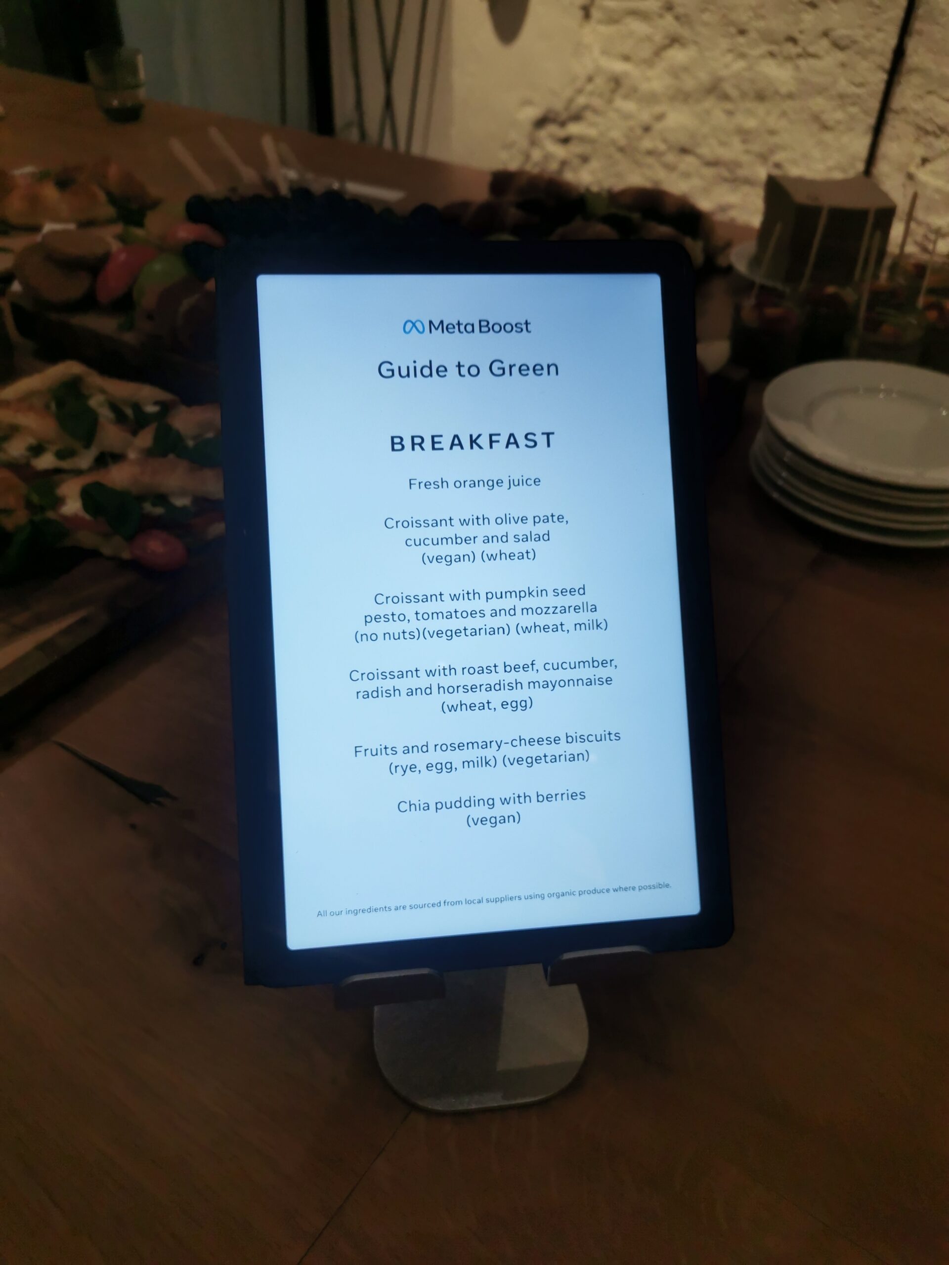 • Üritus oli paberivaba: kogu üritust puudutav info ning programm kuvati vaid ekraanil, sh menüüde printimise asemel kasutasime laudadel tahvelarvuteid, kuhu sisestasime menüüd.